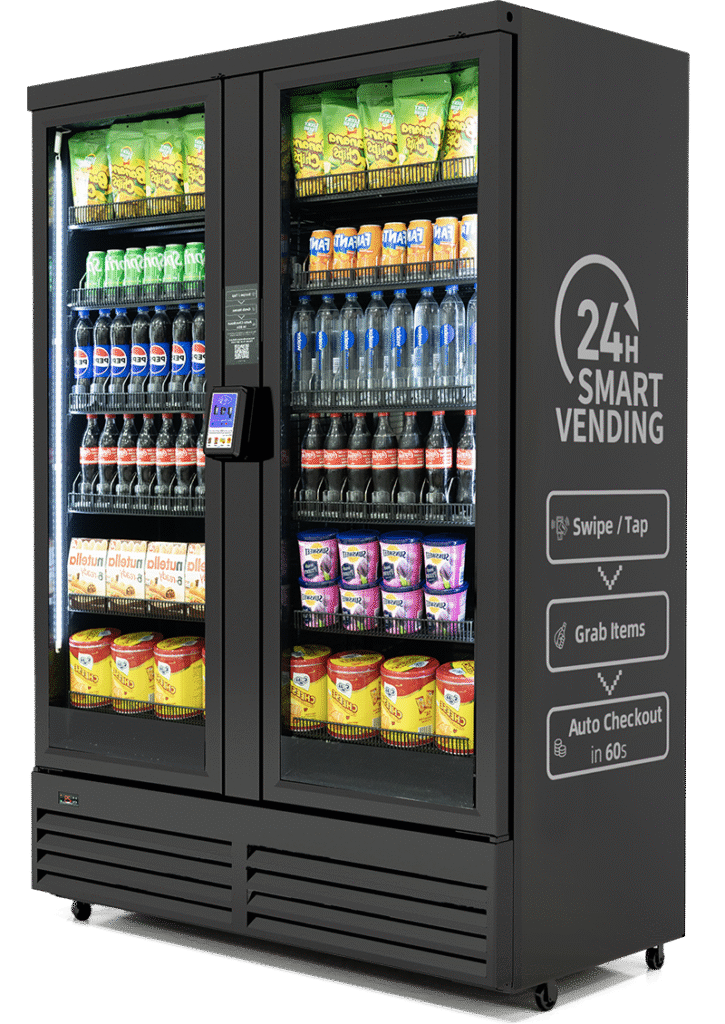 A micro market–style setup offering 24/7 access to snacks and drinks.